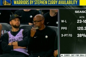 勇士主場(chǎng)迎戰(zhàn)馬刺,鏡頭給到庫(kù)里時(shí),轉(zhuǎn)播方給出了本賽季有無庫(kù)里勇士戰(zhàn)績(jī)對(duì)比。