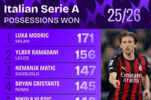 本賽季意甲奪回球權(quán)榜:40歲莫德里奇171次第一,馬蒂奇第三