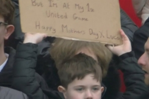 比賽現(xiàn)場(chǎng)看臺(tái)有一位可愛(ài)的小球迷高舉紙牌,上面寫(xiě)道:“對(duì)不起媽媽?zhuān)墙裉焓俏业谝淮蝸?lái)到現(xiàn)場(chǎng)看曼聯(lián)比賽,祝您母親節(jié)快樂(lè)!”
