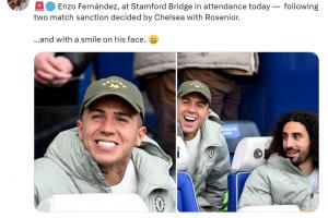 羅馬諾曬照并寫道:“在羅塞尼爾決定對他處罰兩場禁賽后,恩佐今天來到斯坦福橋看球?!?/p>