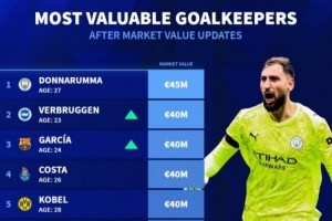 體育資訊4月5日訊 轉(zhuǎn)會(huì)市場(chǎng)網(wǎng)更新了門將身價(jià)排行榜,目前曼城門將多納魯馬身價(jià)4500萬(wàn)歐元最高,在他身后是布萊頓門將維爾布魯根,身價(jià)4000萬(wàn)歐元。