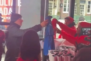 在隊(duì)伍的最前端,可以看到球迷們進(jìn)入一棟建筑領(lǐng)取加拿大的球衣,視頻中有一名球迷將一件藍(lán)色的意大利兒童球衣交給志愿者,后者遞給他一件紅色的加拿大球衣。實(shí)際上,志愿者們并沒有真的在收集意大利球衣,只是為了免費(fèi)發(fā)放加拿大球衣。