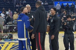 賽前,火箭球星杜蘭特和勇士核心庫里來到場地中央,進(jìn)行一波交流。