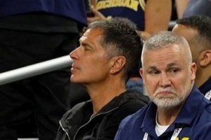 湖人總裁兼總經理佩林卡現(xiàn)場觀戰(zhàn)NCAA決賽,給母校密歇根加油。
