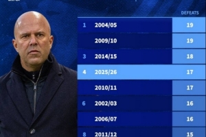 體育資訊4月9日訊 在歐冠淘汰賽首回合,利物浦0-2不敵巴黎。這是利物浦本賽季各項賽事第17場失利,以下為利物浦本世紀(jì)單賽季輸球場次榜: