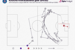 據(jù)統(tǒng)計,克瓦拉茨赫利亞進球前巴黎共完成27次連續(xù)傳球,在本賽季歐冠僅有3粒進球比這次破門前傳球次數(shù)更多。