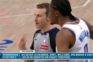 比賽中轉(zhuǎn)播方曬出一組數(shù)據(jù):本賽季雷霆擺出亞歷山大+多特+杰倫威+霍姆格倫+哈滕的首發(fā)組合一共只打了101分鐘,期間正負(fù)值高達(dá)+60!