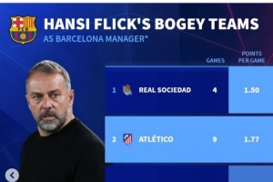 弗里克執(zhí)教巴薩以來克星排名(至少對(duì)陣3場(chǎng)):