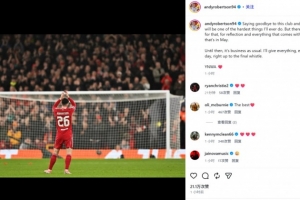 羅伯遜曬出自己向安菲爾德的謝場(chǎng)照,并表示:“告別這家俱樂(lè)部和球迷們將是我人生中最艱難的決定之一。但此后將會(huì)有那么一個(gè)時(shí)刻,讓我好好回顧并感受一切——那就是五月份?!?/p>