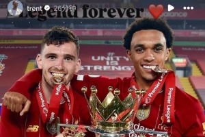 阿諾德曬出了自己效力利物浦時(shí)期和羅伯遜一同捧起英超冠軍獎(jiǎng)杯的合照,并配文:“永遠(yuǎn)的傳奇!”