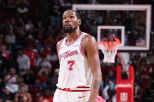 前三節(jié)結束時,火箭還以96-73領先76人23分。當時杜蘭特被換下場休息,有望三節(jié)打卡。結果末節(jié)火箭場上球員表現太抽象,被76人轟出一波進攻高潮追到11分,直接把杜蘭特打了回來。76人攻擊波還在繼續(xù),把分差縮小到7分,杜蘭特命中三分+助攻阿隆·霍勒迪投進三分,為火箭穩(wěn)住局面。