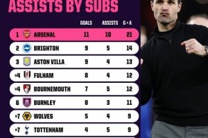 體育資訊3月17日訊 Opta統(tǒng)計了2025/26賽季英超聯(lián)賽中,各隊替補球員貢獻的進球和助攻數(shù)據(jù),阿森納位列第一。