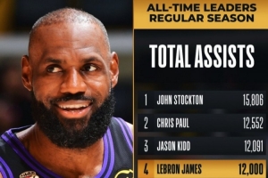 詹姆斯常規(guī)賽生涯總助攻數(shù)突破12000,NBA歷史第四人,僅次于斯托克頓、保羅和基德。