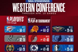 西部第3與第4將在湖人與掘金之間決出;西部第8與第9將在開拓者與快船之間決出;
