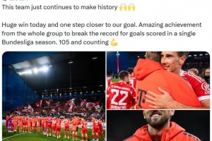他也在賽后通過(guò)社媒曬出比賽照,并慶祝勝利:“這支球隊(duì)仍在創(chuàng)造歷史????今天取得重大勝利,離我們的目標(biāo)又近了一步。全隊(duì)共同努力取得非凡成就,打破了德甲單賽季進(jìn)球紀(jì)錄。目前已經(jīng)105球了,而且還在繼續(xù)增加!”