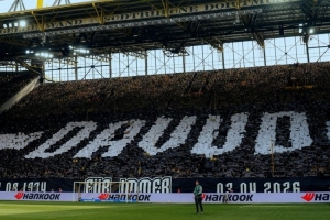 在對(duì)陣?yán)瘴謳?kù)森的比賽之前,多特南看臺(tái)球迷展示TIFO,致敬已故的多特俱樂(lè)部工作人員達(dá)烏德·穆罕默德。