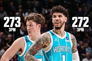 拉梅洛·鮑爾本場(chǎng)投中5記三分,賽季三分命中數(shù)是272記,惜敗隊(duì)友克尼佩爾排在聯(lián)盟第二。
