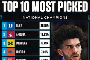 據統(tǒng)計,杜克大學目前是奪冠最大熱門,支持率高達26.51%位居榜首。亞利桑那大學(16.93%)和密歇根大學(13.79%)分列二三。之后是佛羅里達大學、休斯敦大學、岡薩加大學、普渡大學、康涅狄格大學、阿肯色大學和愛荷華州大。排在前四的正是四大賽區(qū)的一號種子。