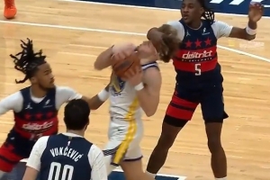 GIF-波爾津吉斯被沃特金斯一巴掌拍到臉部,吃T了