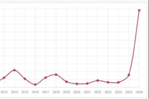 這張折線圖展示了在2010年至2026年間,關(guān)鍵詞“擺爛”在每1000條謠言中的提及次數(shù)的變化趨勢(shì)。