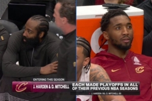 騎士VS獨行俠,轉(zhuǎn)播方曬出紀(jì)錄:哈登和米切爾生涯每個賽季都打進(jìn)了季后賽。