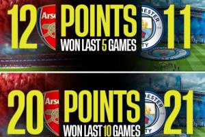 有媒體列出了兩隊近5輪、10輪以及20輪的積分對比,結(jié)果阿森納近5輪積分比曼城多1分,近10輪、20輪積分則比曼城少1分。