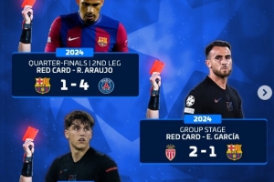 體育資訊4月15日訊 在歐冠淘汰賽次回合,巴薩2-1擊敗馬競(jìng),加西亞吃到紅牌,這是巴薩近3個(gè)賽季在歐冠吃到的第6張紅牌,以下為具體情況: