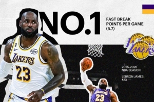 體育資訊4月16日訊 今日,湖人官推更新一張海報(bào),祝賀球星詹姆斯本賽季常規(guī)賽場(chǎng)均快攻得分5.7分聯(lián)盟第一。