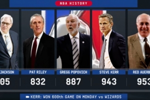 (神算子帕特·萊利832場(chǎng)第2少,波波維奇887場(chǎng)第3少,紅衣主教奧爾巴赫953場(chǎng)排在第5)