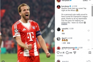 凱恩社媒曬出慶祝進球的照片,配文:“四分之一決賽,我們來了!安聯(lián)球場的精彩夜晚!”