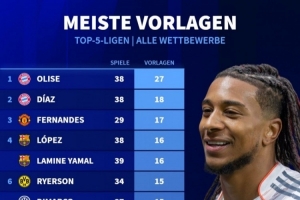 體育資訊3月21日訊 德國(guó)轉(zhuǎn)會(huì)市場(chǎng)統(tǒng)計(jì)了五大聯(lián)賽球員本賽季各賽事的助攻次數(shù),并列出榜單,奧利塞27助斷層居首。
