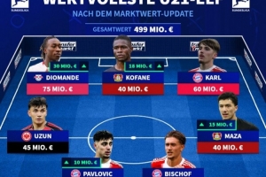 體育資訊3月21日訊 德古轉(zhuǎn)會市場列出德甲U21球員身價最高陣容,帕夫洛維奇、卡爾、揚·迪奧曼德、武什科維奇在列。