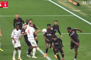 比賽第26分鐘,拜仁前場任意球機(jī)會,塔門前將球擋進(jìn)球門,但因手球被吹無效,拜仁仍0-1落后勒沃庫森。