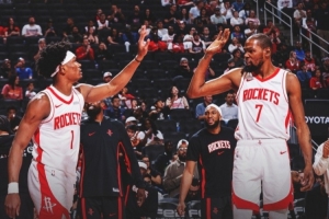 賽后火箭官推發(fā)布贏球海報,封面是阿門和杜蘭特?fù)粽扑查g。
