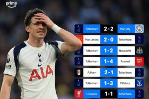 近8場(chǎng)英超聯(lián)賽中,熱刺僅在對(duì)陣曼城和利物浦的比賽中拿到分?jǐn)?shù),其它六場(chǎng)比賽全部輸球。