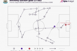 數(shù)據(jù)統(tǒng)計顯示,戈登的這粒進球,紐卡斯爾11名球員中有10人參與其中,沃爾特馬德是在此期間唯一沒有觸球的球員。