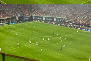 美國隊(duì)在梅賽德斯-奔馳體育場進(jìn)行本場比賽時(shí),身著為今年夏天世界杯發(fā)布的新款球衣。這款球衣采用了美國國旗的色調(diào),球衣上印有波浪狀的紅色和白色條紋,球衣背面則有大面積的白色區(qū)域。