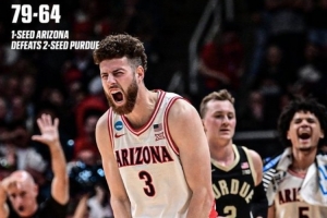 體育資訊3月29日訊 今天結(jié)束的一場(chǎng)NCAA錦標(biāo)賽8強(qiáng)戰(zhàn),亞利桑那大學(xué)79比64擊敗普渡大學(xué),晉級(jí)4強(qiáng)。
