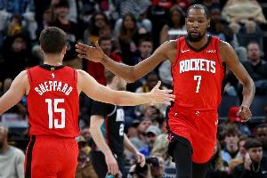 本場比賽,火箭先發(fā):謝潑德、阿門、杜蘭特、賈巴里、申京。