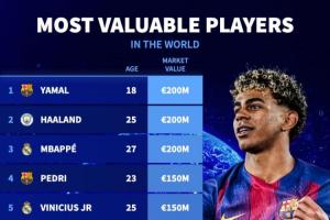 體育資訊03月30日訊 在更新多個(gè)聯(lián)賽身價(jià)后,德轉(zhuǎn)盤點(diǎn)當(dāng)前足壇身價(jià)TOP50。亞馬爾、哈蘭德、姆巴佩2億歐領(lǐng)銜,20人身價(jià)過億,意甲僅勞塔羅和伊爾迪茲進(jìn)入前50。