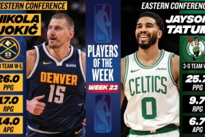 體育資訊3月31日訊 今天,NBA官方公布了25-26賽季第23周東西部周最佳球員,塔圖姆和約基奇當(dāng)選。