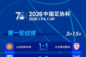 體育資訊3月15日訊 2026年足協(xié)杯第一輪第三個比賽日結(jié)束,北京通州鵬瑞、寧夏平羅恒利、武漢聯(lián)鎮(zhèn)、聊城傳奇綠業(yè)春、泉州青工走走紡織五支球隊晉級。