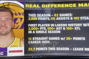 湖人VS奇才,轉(zhuǎn)播方曬出東契奇賽季數(shù)據(jù):