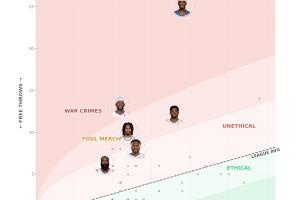 Unethical Hoops的“無德”指數(shù)主要依靠罰球數(shù)量vs出手?jǐn)?shù)的比值來進(jìn)行計(jì)算,數(shù)值越大,越是“沒有道德”;