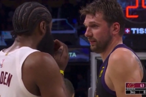 GIF-哈登和東契奇在場(chǎng)上聊天,還捂著胡子